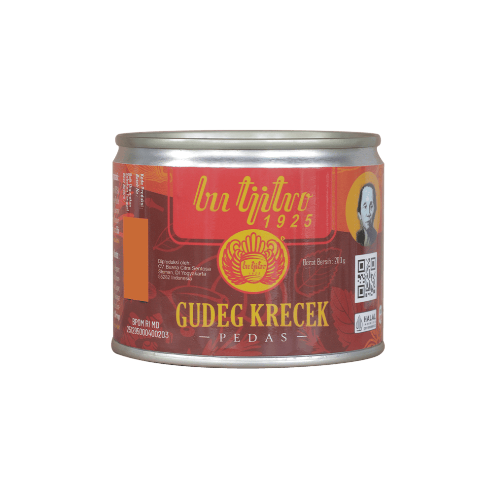 Proses pengolahan menggunakan teknologi pangan modern dengan sistem sterilisasi komersial sehingga tetap higienis. Produk ini sudah memiliki sertifikat BPOM dan Halal MUI, jadi aman dan berkualitas. Gudeg Kaleng Bu Tjitro 1925 bisa bertahan 12–18 bulan tanpa bahan pengawet, cocok untuk oleh-oleh maupun dikonsumsi sendiri.